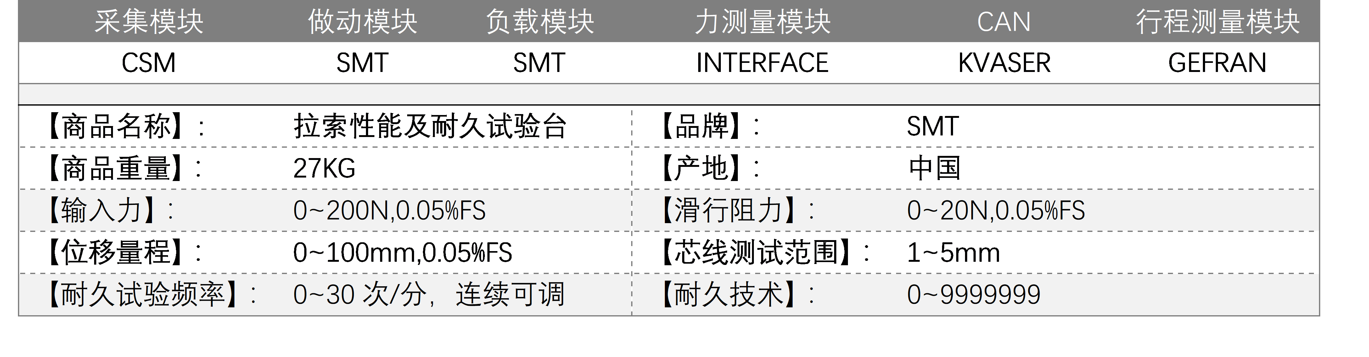該試驗(yàn)臺按相關(guān)行業(yè)標(biāo)準(zhǔn)設(shè)計,實(shí)現(xiàn)操縱拉索的耐久試驗(yàn),可對駐車?yán)€、檔位拉線、油門拉線、全車蓋板拉線等進(jìn)行試驗(yàn),測試其行程效率以及負(fù)載效率等技術(shù)參數(shù)。系統(tǒng)可擴(kuò)展進(jìn)行耐久性試驗(yàn),試驗(yàn)過程能夠統(tǒng)計工作次數(shù),且當(dāng)拉索失效會自動聲或光報警并停止工作,能繪制相應(yīng)的性能曲線,并對相關(guān)的檢測結(jié)果進(jìn)行統(tǒng)計、分析、保存。